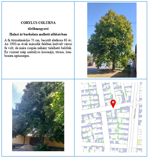 Halasi út 6. szám előtt az útburkolat melletti zöldsávban törökmogyoró |