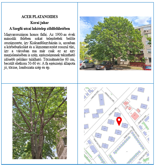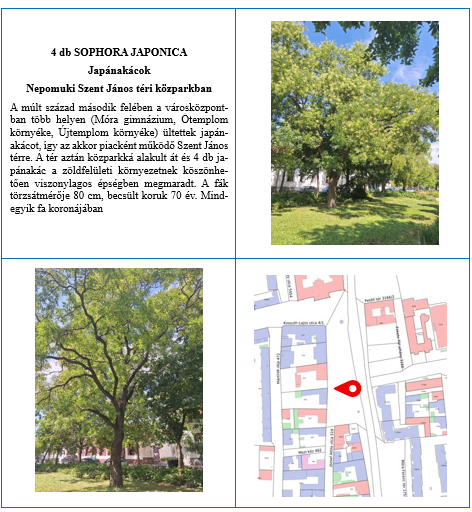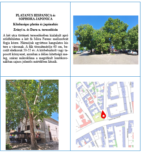 5-ös számú főút, a Móra tér 1-3. szám előtt az útburkolat melletti zöldsávban 3 db közönséges platán |