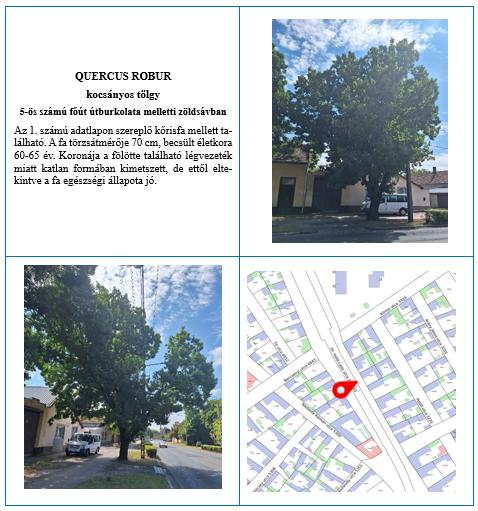 5-ös számú főút, a Dr. Holló Lajos út 37. szám előtt az útburkolat melletti zöldsávban kocsányos tölgy |