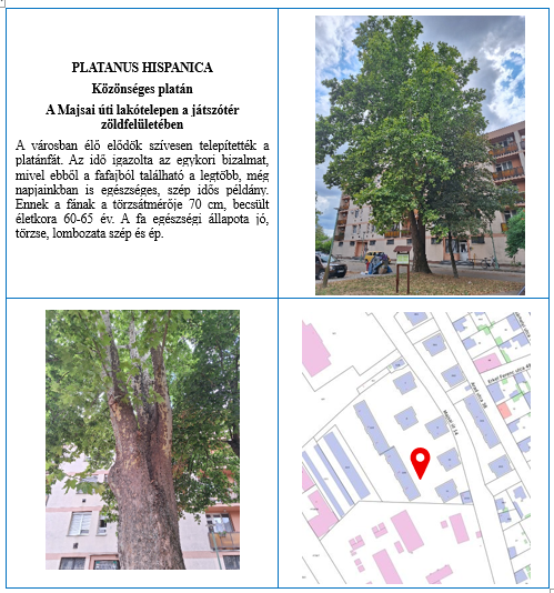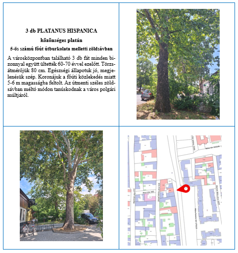5-ös számú főút, a Móra tér 1-3. szám előtt az útburkolat melletti zöldsávban 3 db közönséges platán |