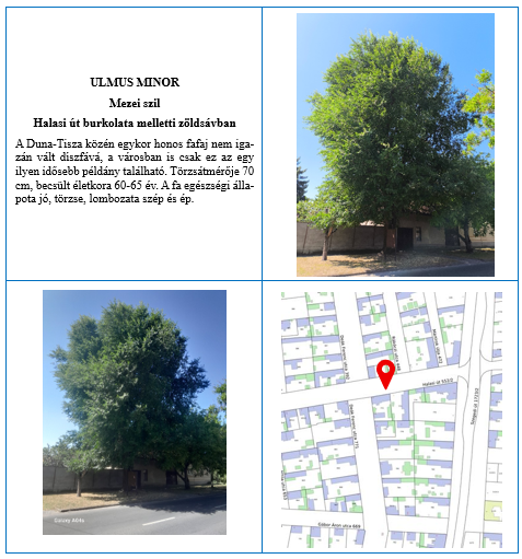 Halasi út 6. szám előtt az útburkolat melletti zöldsávban mezei szil |