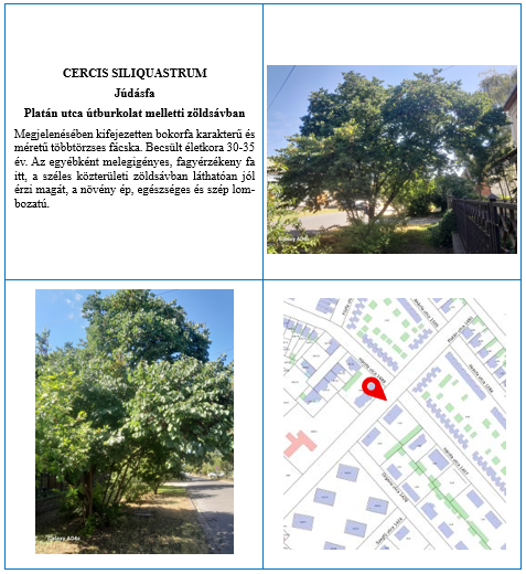Platán utca 15. szám előtt az útburkolat melletti zöldsávban júdásfa |