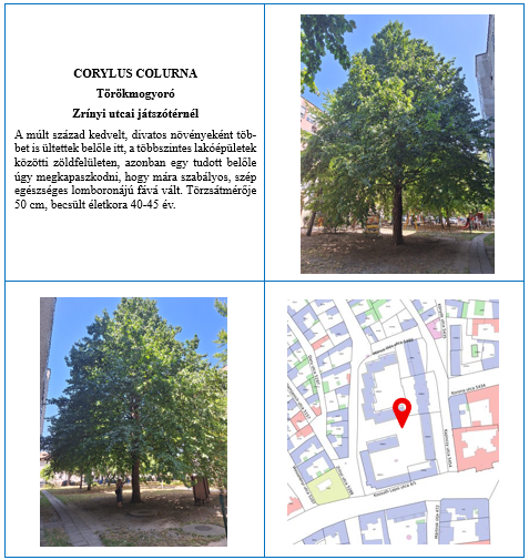 Zrínyi u. 17. szám előtt az útburkolat melletti zöldsávban oszlopos gyertyán |