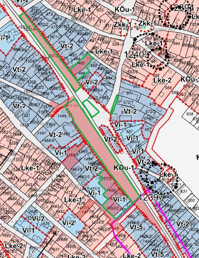 l) a Petőfi utca 1-3/a. szám előtti, úttestig terjedő közterület.