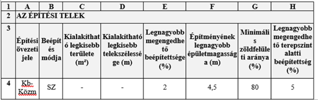 (2) Különleges beépítésre nem szánt terület – közműterület övezeteit, valamint az azokban betartandó telekalakítási és beépítési előírásokat a következő táblázat tartalmazza: