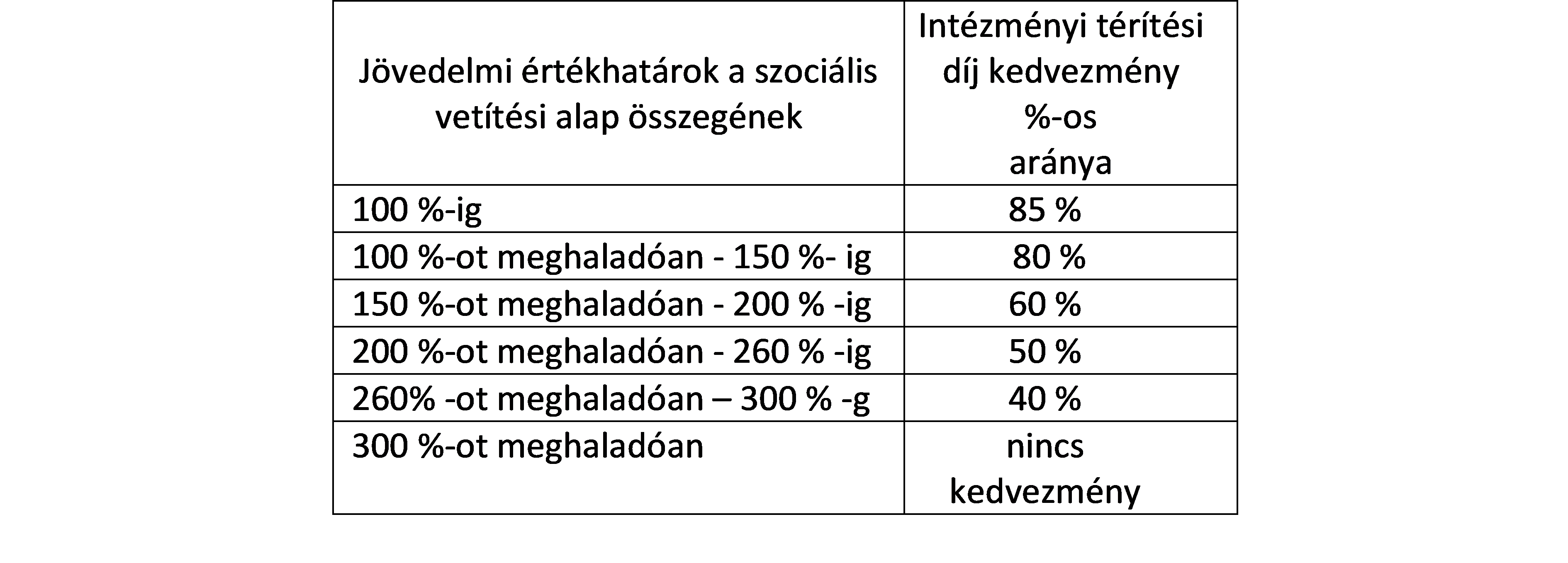 a) az étkeztetés személyi térítési díja differenciáltan, az igénybevevő jövedelme alapján, az alábbi képlet alapján számított térítési díj kedvezmény figyelembe vételével kerül meghatározásra, ahol a 100 %-os kedvezmény felső határa: 20.000 Ft, a 0 %-os kedvezmény alsó határa 120.000 Ft, a fizetésre kötelezettek esetén a minimum fizetendő térítési díj 50 Ft.
